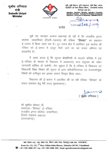 "मुझे यह जानकर अत्यंत प्रसन्नता हो रही है कि राजकीय इंटर कॉलेज जाखणीधार टिहरी गढवाल की पत्रिका हिम्मत का प्रकाशन ई प्रारूप में किया जा रहा है. दूर दराज के क्षेत्रों में अवस्थित इस कॉलेज की पत्रिका को तारों में प्रस्तुत के जानी का यह प्रयास अभिनव ई प्रारूप में प्रस्तुत किये जाने का यह प्रयास अभिनव एवं सराहनीय है.